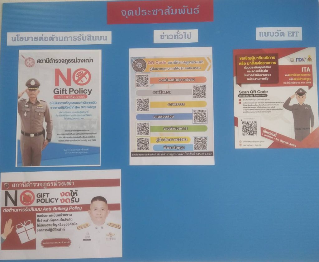 การแสดงอินโฟกราฟิกนโยบายไม่รับของขวัญและของกำนันทุกชนิด (No Gift Policy)จากการปฏิบัติหน้าที่ โดยการติดประกาศ ณ ห้อง One Stop Service ,หน้าห้องพนักงานสอบสวนและที่บอร์ดประชาสัมพันธ์ ของ สภ.ม่วงเฒ่า