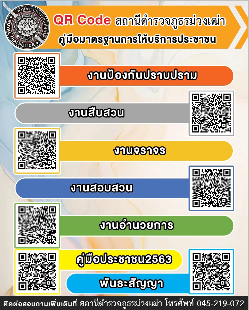 การแสดงคู่มือการให้บริการประชาชน โดยการติดป้าย qr code คู่มือการให้บริการประชาชนประกาศ ณ ห้อง One Stop Service ,หน้าห้องพนักงานสอบสวนและที่บอร์ดประชาสัมพันธ์ ของ สภ.ม่วงเฒ่า